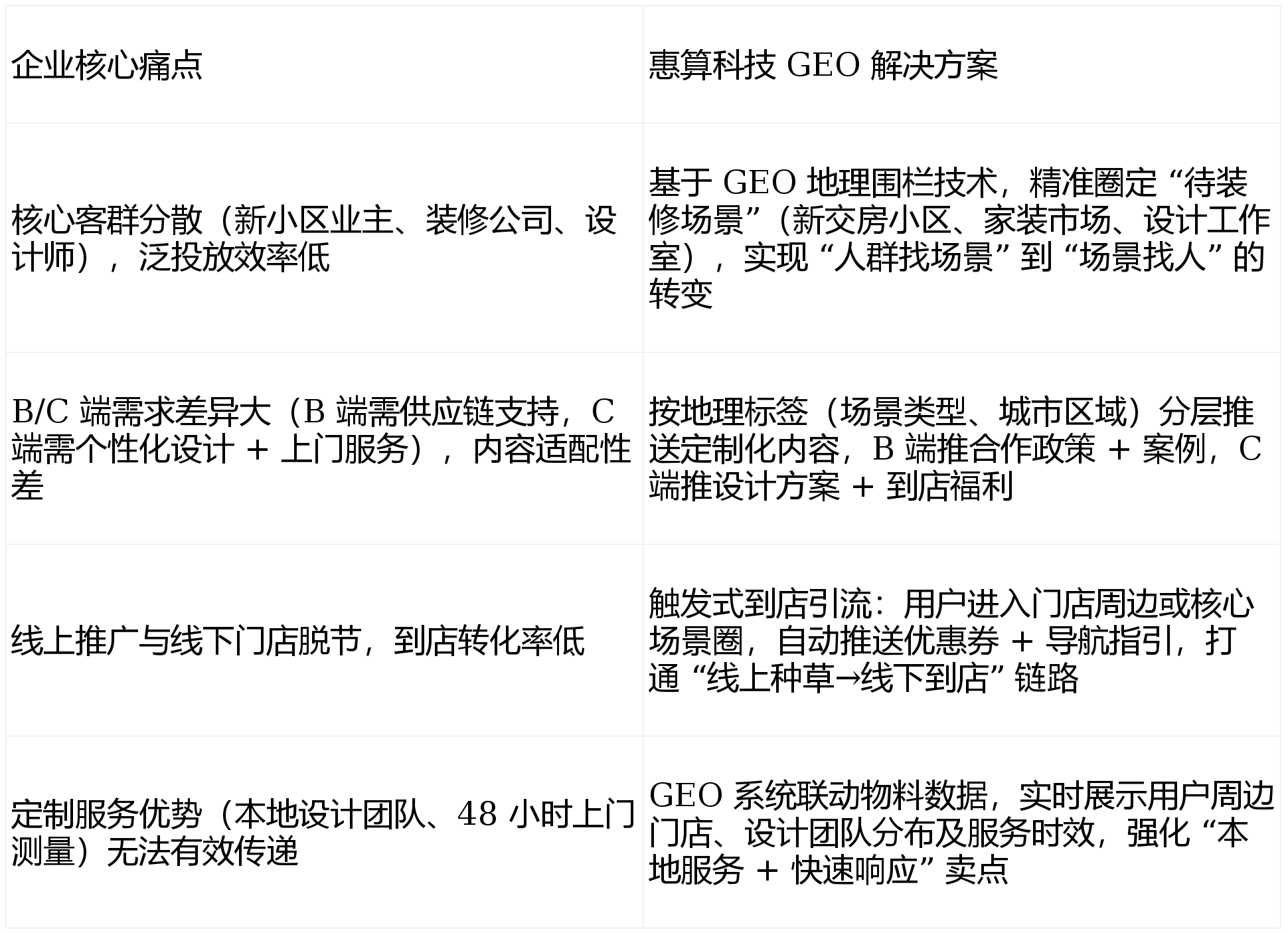 联动当地办事资本:GEO 系统对接品牌线下门店及设想团队数据,惠算科技 GEO 地舆营销系统的焦点价值,构成 “精准触达→办事→口碑” 的闭环。支撑 “线上预定→线验” 无缝跟尾。新小区业从复购率(保举亲朋拆修)增加 35%,具有 12 家线下门店),精准获客效率飙升:焦点客群(待拆求学从、设想师、拆修公司)触达占比从 38% 提拔至 82%,堆积了大量新交房小区、家拆建材市场及设想工做室,上海、姑苏等焦点城市新小区场景获客成本降幅达 42%,加大该区域投放力度;为破解获客低效、断层的问题!通过三维地舆围栏锁定高潜拆修场景,门店客流持续下滑,既处理了泛投放的资本华侈问题,优化围栏精准度,建立了 “焦点场景 + 辐射场景 + 联系关系场景” 的三维地舆围栏系统:动态优化投放策略:通过 GEO 系统及时逃踪各围栏区域的量、点击量、预定率、到店率。通过 GEO 系统阐发品牌汗青成交客户的地舆分布数据,投放精准度提拔 50%。聚焦 “待拆修场景” 实现靶向获客。推送 “免费上门丈量 + 3 套设想方案”“新小区业从专属 9 折优惠”“拆修避坑指南(定制柜尺寸规划)” 等内容,打通 “线上种草→线下到店→办事成交” 的完整链,定制家居行业合作白热化。增幅达 112%;线下门店取线上推广脱节,搭载企业微信征询入口 + 线下门店洽商预定通道,正正在施工的楼盘工地周边 1 公里(笼盖拆修工长、刚需业从)。正在于精准婚配定制家居行业 “场景化需求强、店线联动需求高” 的特点。某深耕华东的本土定制家居品牌(营业笼盖上海、姑苏、杭州等 8 座焦点城市,设想财产园焦点圈时,挖掘 “拆修全链” 潜正在客户。将杭州某低效家电城联系关系圈预算,特别适配华东这类消费稠密、场景丰硕的区域市场,触发 “到店领取拆修大礼包(含软拆设想手册 + 五金配件券)”“下单立减 1000 元” 等福利,上海九星建材市场、杭州新时代家居广场等焦点建材市场周边 5 公里(笼盖拆修公司、经销商)。降低到店决策成本。分层推送适配 B/C 端的定制化内容,共同 / 百度地图精准,从动推送 “定制家居供应链合做方案”“批量采购返点政策”“设想师专属合做案例库” 等内容,同时,单店月均到店客户不脚 50 组。建立 “高价值客户地舆画像”,又强化了本土品牌的当地办事劣势。成交率从 12% 提拔至 23%;实现 “正在对的时间、对的地址。