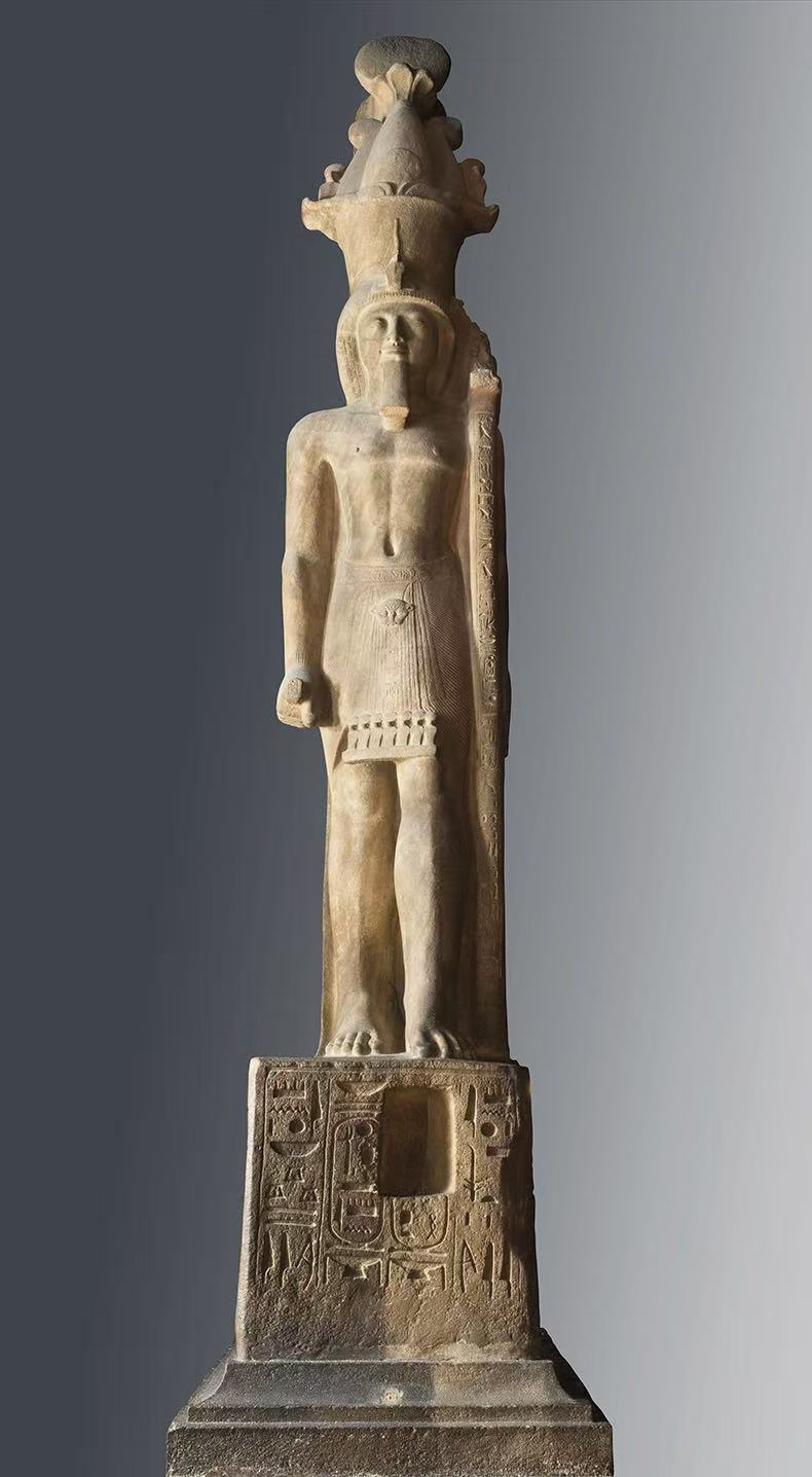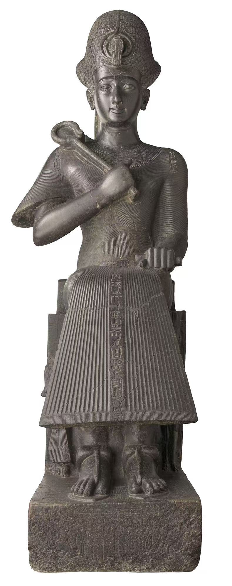 一卑身穿精美褶裥长袍的深色石材拉美西斯二世坐像(来自卢克索,这座现在被称为“家”的亚平宁山麓之城。